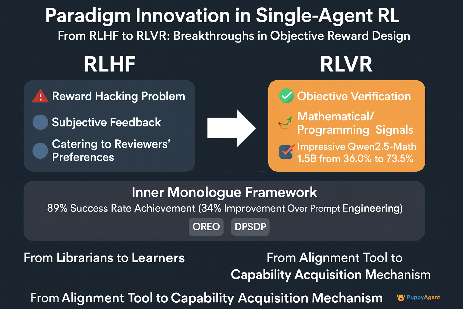 従来のRLHF(人間からのフィードバックによる強化学習)は、主観的な人間のフィードバックに依存し、「報酬ハッキング」の問題に悩まされていました。ICML 2024で、OpenAIの研究者ジョン・シュルマンは率直に次のように述べました。「モデルは、問題を純粋に解決するのではなく、レビュー担当者の好みに合わせることを学習することがわかりました。」これにより、数学やプログラミングなどの分野からの客観的で検証可能なシグナルを活用するRLVR(検証可能な報酬による強化学習)への移行が促進されました。アリババのQwenチームは、このアプローチを適用して、MATH500ベンチマークにおけるQwen2.5-Math-1.5Bの精度を36.0%から73.6%に向上させ、RLが「アライメントツール」から「能力獲得メカニズム」へと進化していることを示しました。