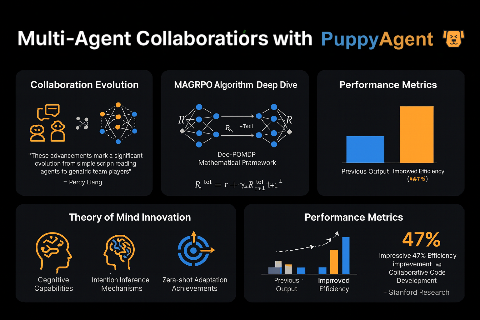 スタンフォード大学のパーシー・リャン教授は次のように述べています。「初期のマルチエージェントの議論は、数人が独立して台本を読んでいるようなものでした。今では、真のチームワークが見られます。」最新のMAGRPOアルゴリズムは、LLMの協調をDec-POMDP(分散型部分観測マルコフ決定過程)としてモデル化し、共同報酬の最適化を通じて真の協力を実現します。協調的なコード開発テストでは、このアプローチは従来のマルチターン対話手法と比較して効率を47%向上させました。さらに興味深いことに、別のスタンフォード大学のチームは、エージェントに「心の理論」モジュールを装備させ、他の参加者の意図や戦略を推測できるようにしました。これにより、ゼロショットのゲーム環境で驚くべき適応能力を発揮しました。