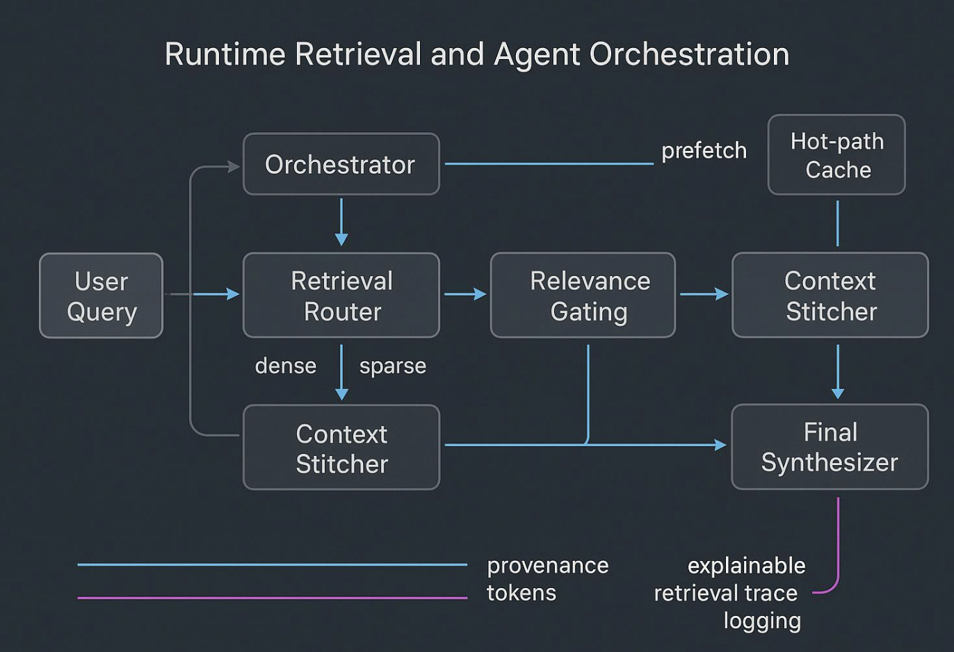 このセットアップで、オーケストレーションループは「PO‑2026‑1783を本日承認可能か?」のクエリを:PO IDのsparseルックアップ、そのPOからPolicyと例外へのグラフウォーク、直近承認者ノートのdense検索でルート。ステッチャーは1.2Kトークンバンドルに圧縮し、エージェントは承認決定と出所リンク付きの簡潔な引用回答を生成。
