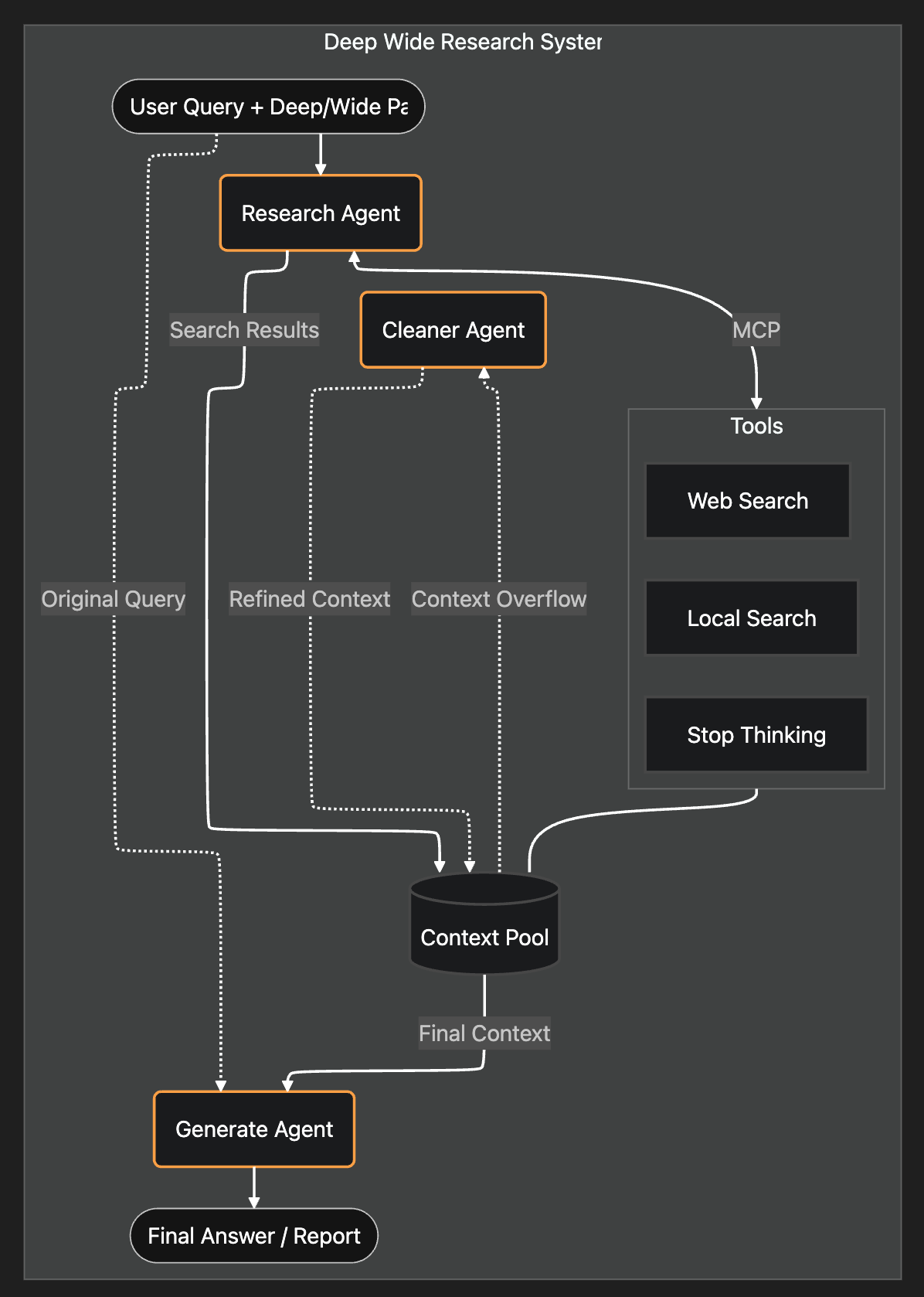 すべてのリサーチ結果は、共有のコンテキストプールに保存されます。リサーチャーが「停止」のシグナルを送ると、生成エージェントがコンテキストプールを取得し、最終的な回答を生成します。