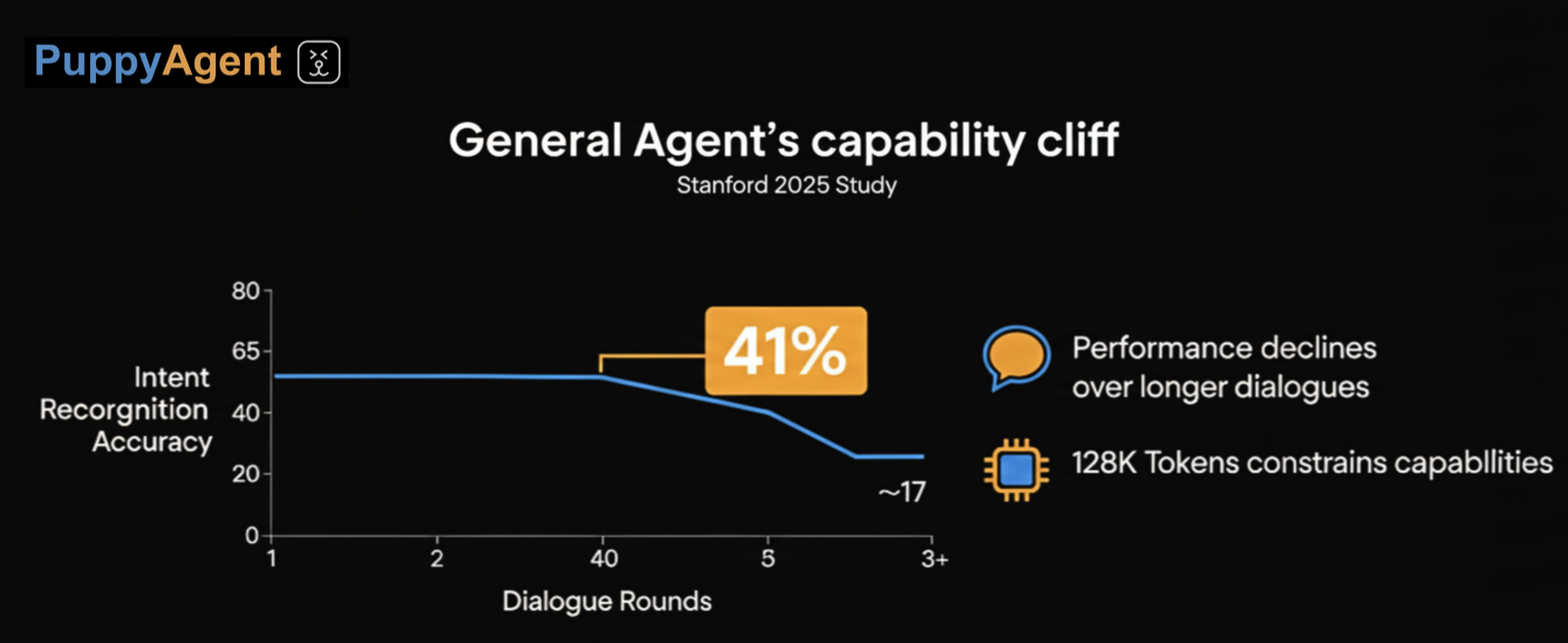 No entanto, quando a maioria das empresas tenta aplicar os chamados Agentes de IA gerais a cenários profissionais, frequentemente encontram um "penhasco de capacidade". Um teste de 2025 da Universidade Stanford revelou um fato chocante: quando as instruções do usuário excedem três rodadas de diálogo, a precisão de reconhecimento de intenção dos Agentes gerais despenca para 41%. Embora modelos como Claude tenham expandido o prompt do sistema para 128K tokens, em cenários multi-papel, esses Agentes ainda frequentemente confundem as verdadeiras necessidades dos usuários, interpretando erroneamente consultas simples como decisões complexas.