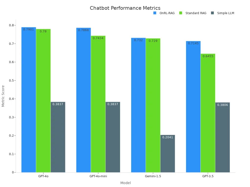 Empirical studies highlight the effectiveness of this approach. For instance, the OnRL-RAG framework consistently outperforms standard RAG and simple LLMs across various models. The table below illustrates the performance metrics: